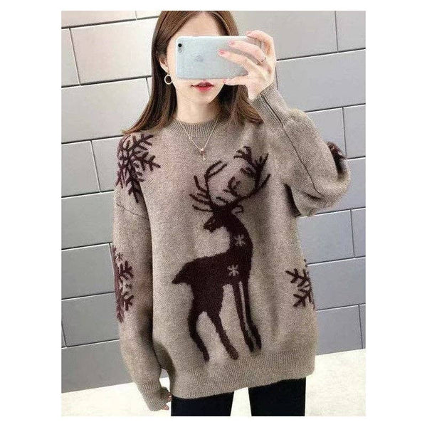 Discover the Deer Jacquette Round Neck Knit Sweater, crafted from soft viscose fiber for ultimate comfort. This loose-fit, round-neck sweater features long sleeves, perfect for a cozy, stylish look. Ideal for everyday wear, it combines breathability with a trendy design.